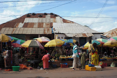 As vendas entopem as ruas com estendais de artigos e lixo nas bermas, as vendas entram em espaços tapados que era suposto serem mercados oficiais mas que estão congestionados de negócio, há apenas uns corredores muito estreitos por onde as pessoas circulam, se alguém pára a ver uns artigos toda a fila de gente que vai atrás pára também, dá-se o caos de engarrafamento, o calor é sufocante. Entrámos e saímos de ruas e carreirinhos, fomos olhados com espanto, pisámos bocados de couve podre, enjoámos com o cheiro do peixe a secar, ensurdecemos com o despique da música mais alta, ora em praças destapadas ao sol, ora em vielas escuras, constantemente assaltados pelas moscas.